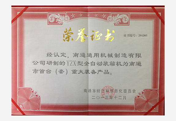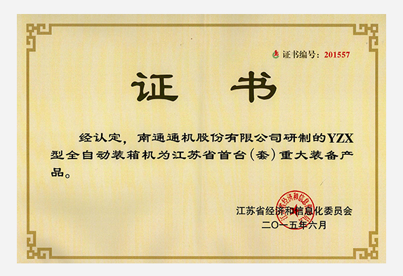 南通首台套重大装备产品证书